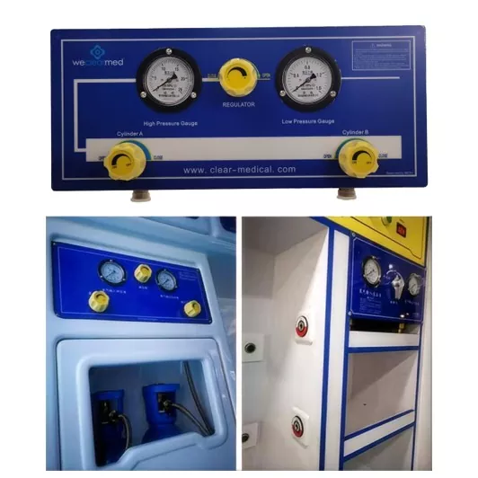 Оваа единица за колектори на медицински гас е погодна за амбулантни возила со голема потрошувачка на кислород. Влегува флаширан кислород со висок притисок преку метално црево до главниот гасовод на контролниот панел, а кислородот со висок притисок се доставува до терминалот на кислород преку гасоводот со низок притисок по депресирање што ќе се користи како извор на кислород за употреба од прва помош. Работен принцип е да се декомпресира кислородот со висок притисок во низок притисок и да се достави до терминалот на кислород преку соодветниот гасовод, со цел да се обезбеди портата на терминалот на кислородот и портата за вентилатор. Контролниот панел може да биде поврзан со два или повеќе цилиндри на кислород во исто време за да го декомпресираат флашираниот кислород со висок притисок на одреден притисок, што е еден вид опрема за централизирано снабдување со гас. Контролниот панел се состои од цевковод со висок притисок изработен од метално црево, кое е поврзано со цилиндрите на кислородот преку навои G5/8. Секој цилиндер на кислород е поврзан со контролниот панел со соодветниот вентил за преклопување под висок притисок, кој го контролира соодветниот гасовод со висок притисок. Гасоводот со висок притисок што го поврзува секој цилиндар на кислород на задниот крај на вентилот за преклопување е поврзан едни со други, а колекторот е опремен со конектор за мета во средината на колекторот за да го поврзе мерачот со висок притисок, регулаторот и цевководот со висок притисок во серија. Мерачот на висок притисок се користи за следење на притисокот на кислородот во цевководот со висок притисок на контролниот панел, а регулаторот се користи за регулирање на кислородот со висок притисок до потребниот притисок и потоа да се излезе на терминалот со низок притисок. Крајот на низок притисок е поврзан со терминалот на кислород, безбедносниот вентил и мерачот со низок притисок, кој се користи за следење на притисокот во цевководот со низок притисок на контролниот панел, додека безбедносниот вентил автоматски го исцрпува гасот кога излезниот притисок е поголем од дизајнерскиот притисок, за да се обезбеди безбедност и стабилност на излезниот притисок. Овој систем е погоден за кое било место каде што е потребно префрлување на конвергенција на гас за да се следи преостаната количина на гас и гасот, како што се: болници, амбулантни возила, нафта, течни нафтени гасни станици и други индустриски и рударски претпријатија и институции.