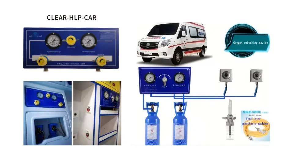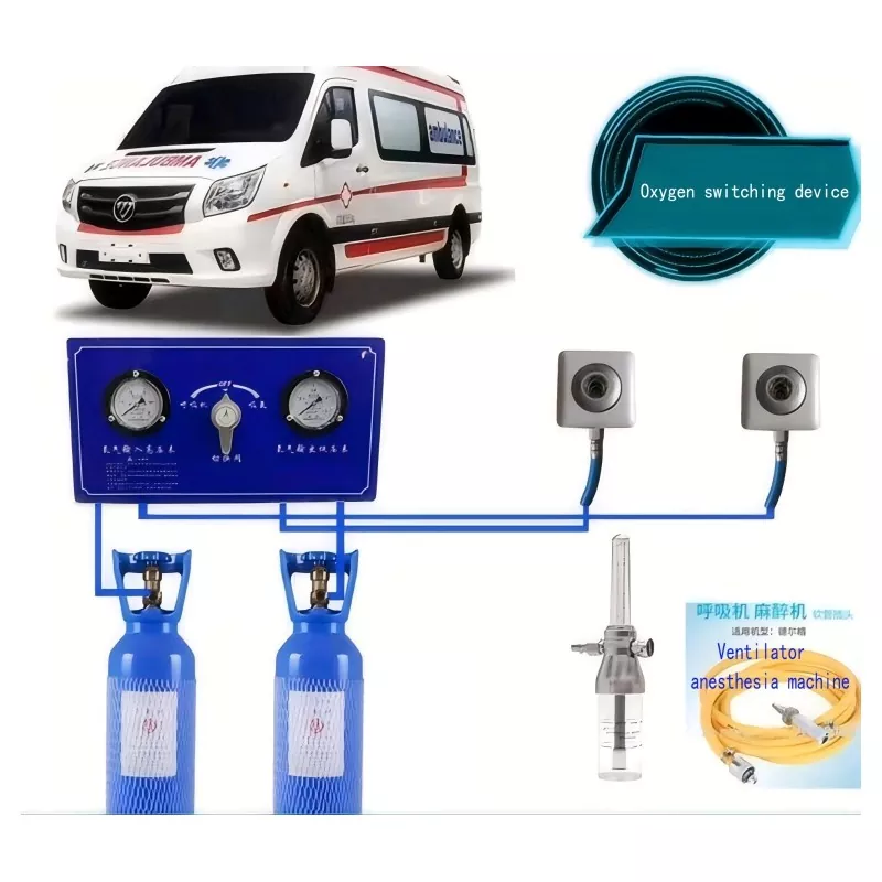 1. Овој уред е погоден за амбулантни возила со голема потрошувачка на кислород. Кислородот со висок притисок со шишиња е влез во главната цевка на контролната табла преку метално црево. Откако се намалува кислородот со висок притисок, тој се транспортира во терминалот на кислород преку цевка со низок притисок, која се користи како извор на кислород за итна употреба. Неговиот принцип на работа е да се декомпресира кислородот со висок притисок на низок притисок, соодветно преку сопствените цевководи до терминалот на кислород, до терминалот на кислород и портата за вентилатор за употреба.