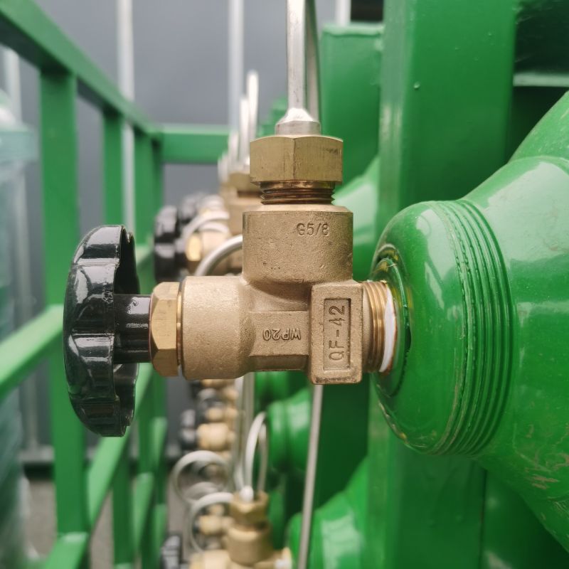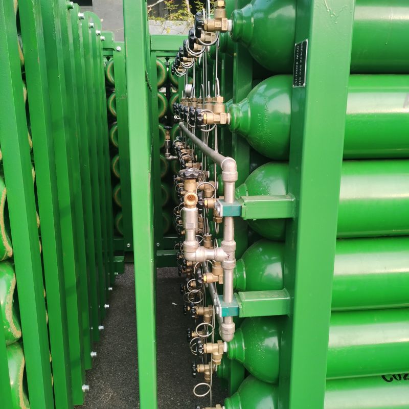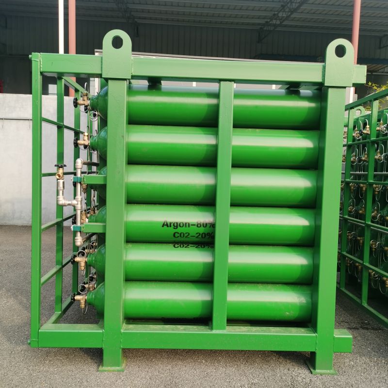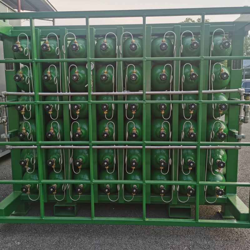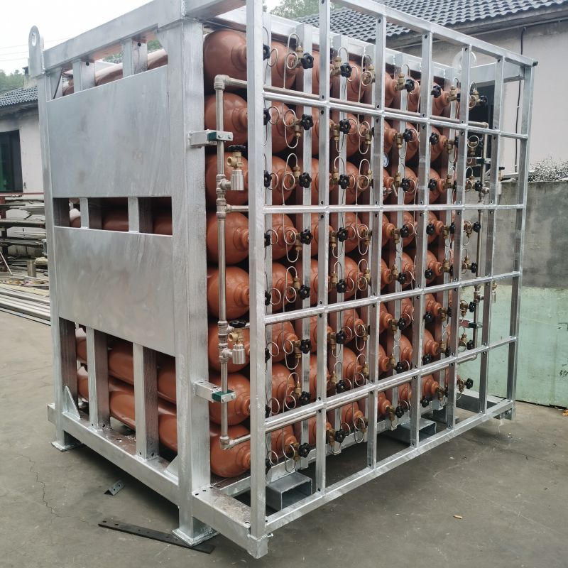 Принцип на дизајн: Прво дизајнирајте челична рамка која може да собере неколку шишиња, што е погодно за целокупно полнење, целокупен транспорт и движење. Потоа наполнете ги цилиндрите за гас и поправете ги и на крајот поврзете го секој вентил за шишиња преку банкините под висок притисок. Сите излези на цилиндрите се меѓусебно поврзани еден со друг за да можат да се користат како целина истовремено.